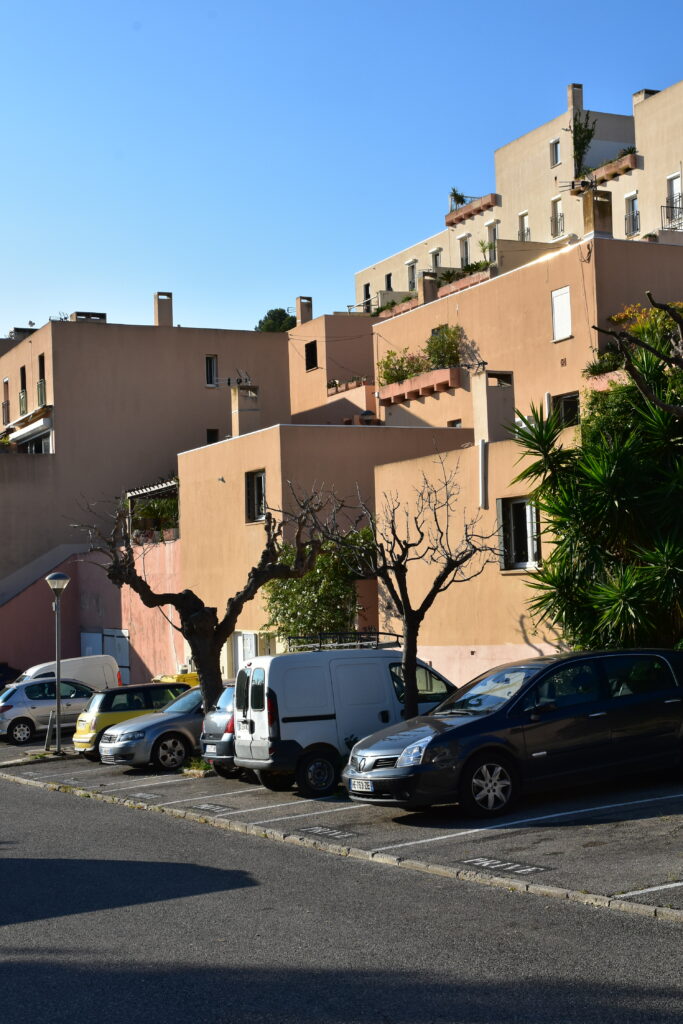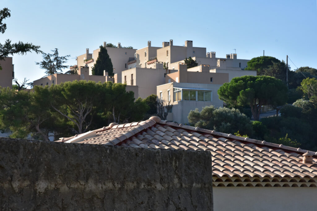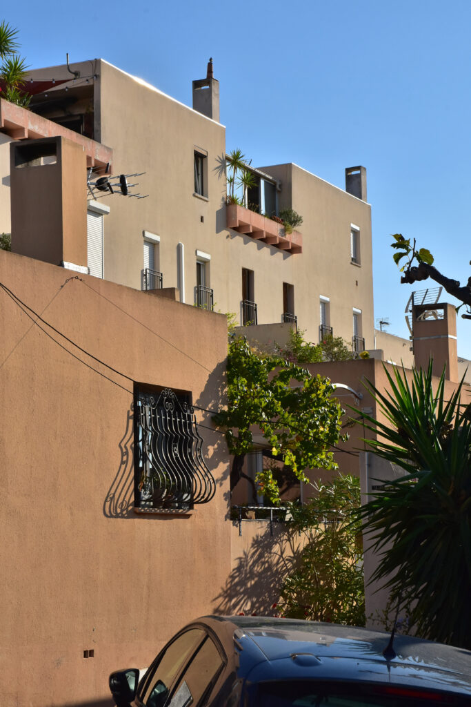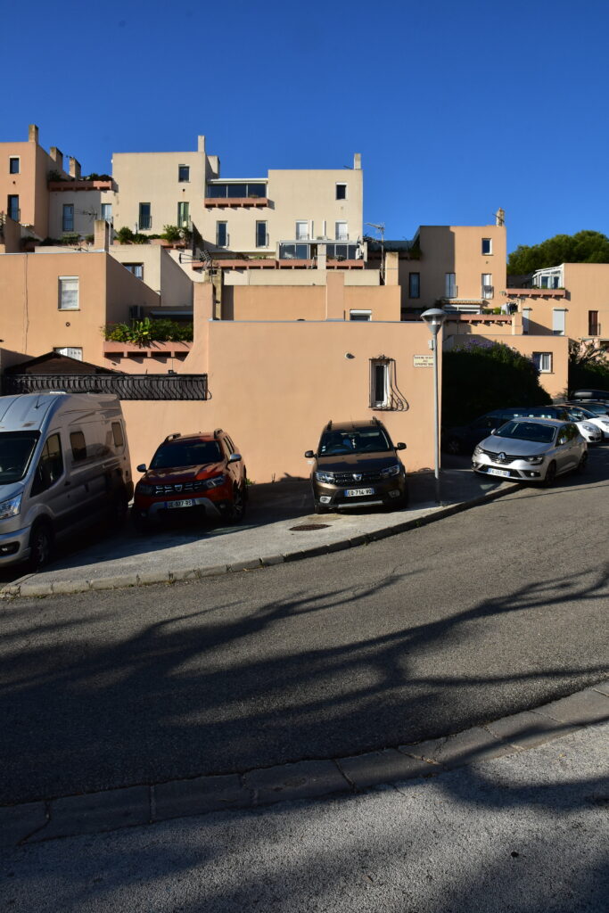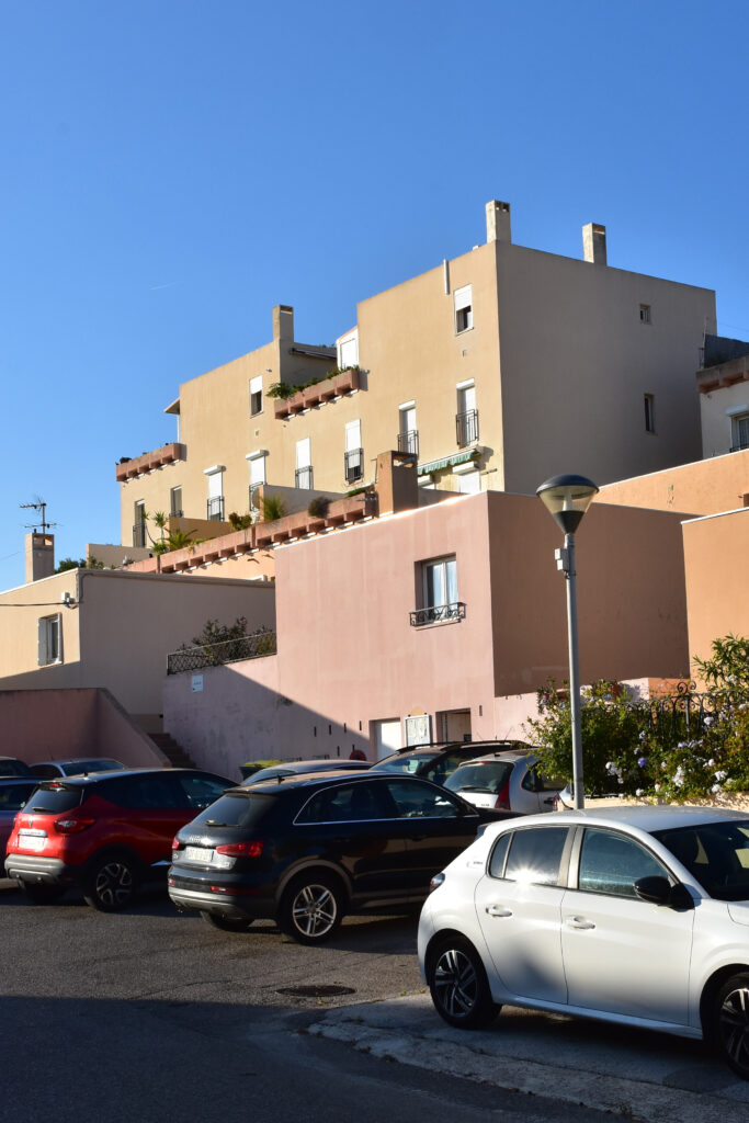 Construit sur un terrain en forte pente et d’orientation Est-Nord-Est, le quartier de Notre-Dame de la Garde domine la baie de La Ciotat. Cet ensemble d’habitations « en tapis » (170 logements en copropriété, individuels et semi-collectifs) a été conçu par Fabien Vienne (1925-2016), architecte et urbaniste formé à l’école des Arts appliqués, concepteur de mobilier et de jeux de construction qui explorent la géométrie. La compacité et l’imbrication des cubes et des terrasses en gradin évoquent l’architecture cycladique.