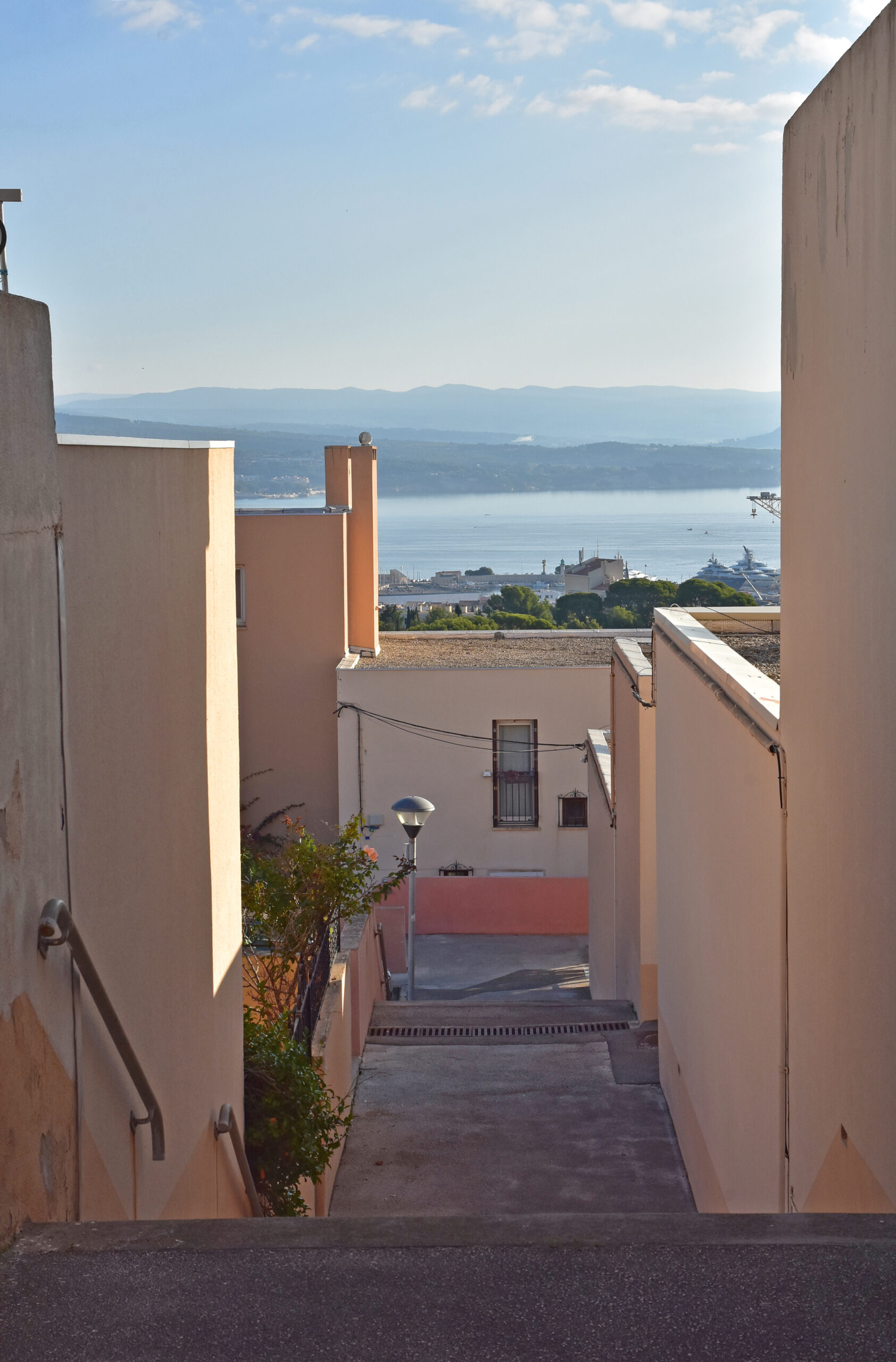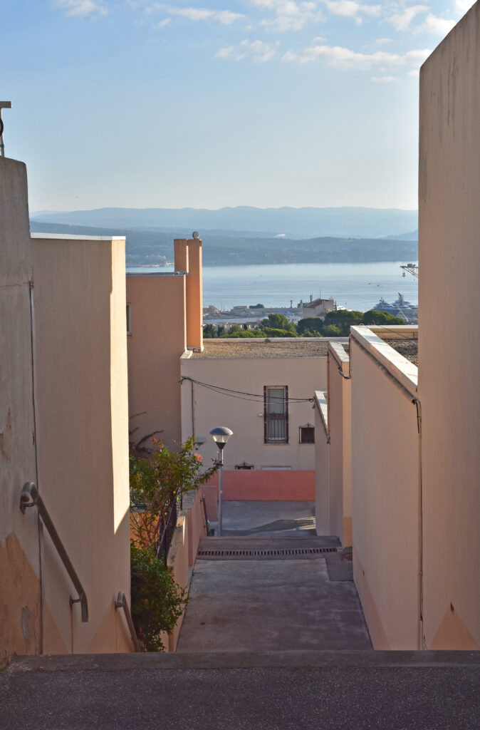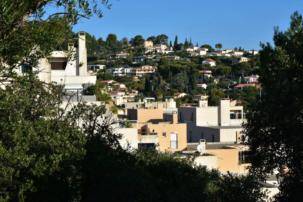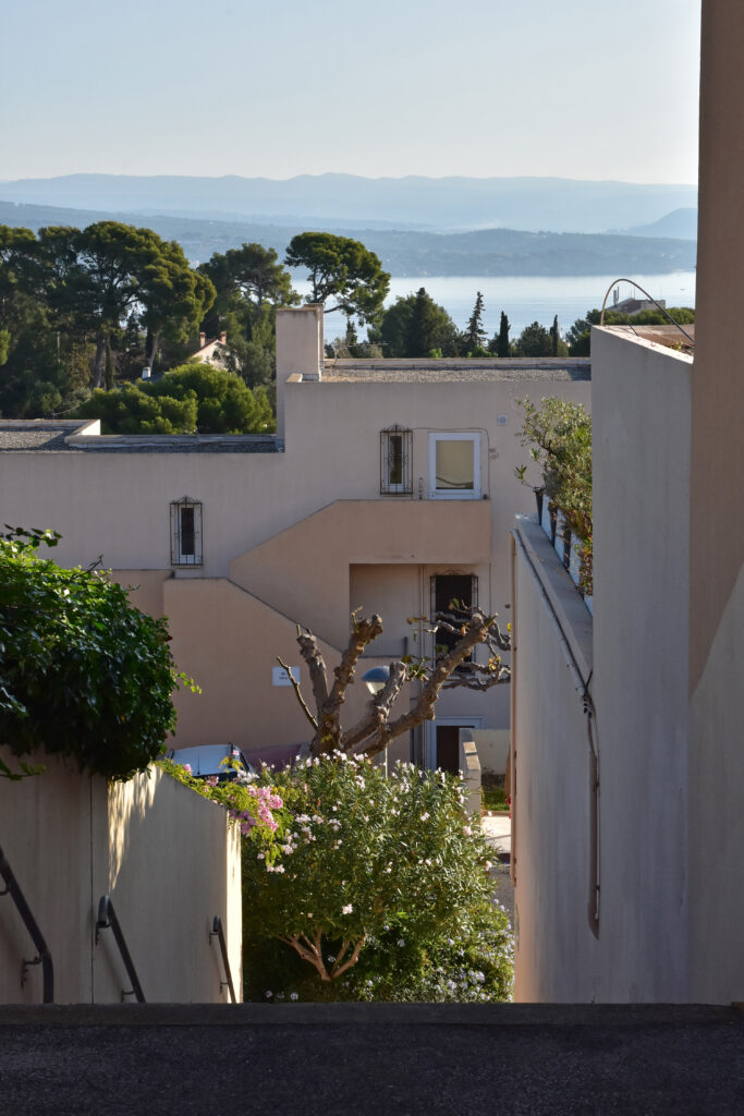 Construit sur un terrain en forte pente et d’orientation Est-Nord-Est, le quartier de Notre-Dame de la Garde domine la baie de La Ciotat. Cet ensemble d’habitations « en tapis » (170 logements en copropriété, individuels et semi-collectifs) a été conçu par Fabien Vienne (1925-2016), architecte et urbaniste formé à l’école des Arts appliqués, concepteur de mobilier et de jeux de construction qui explorent la géométrie. La compacité et l’imbrication des cubes et des terrasses en gradin évoquent l’architecture cycladique.