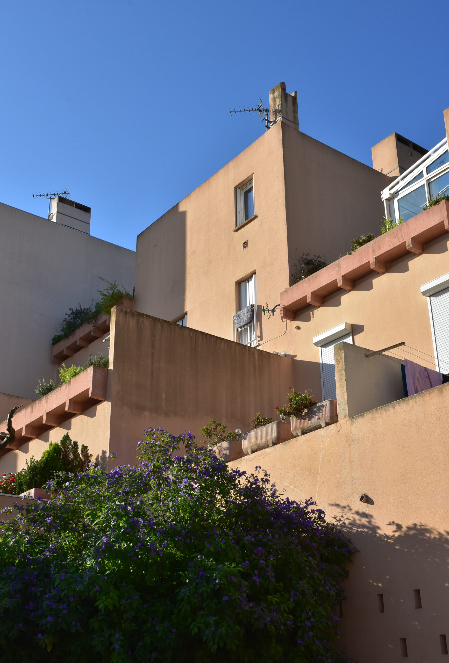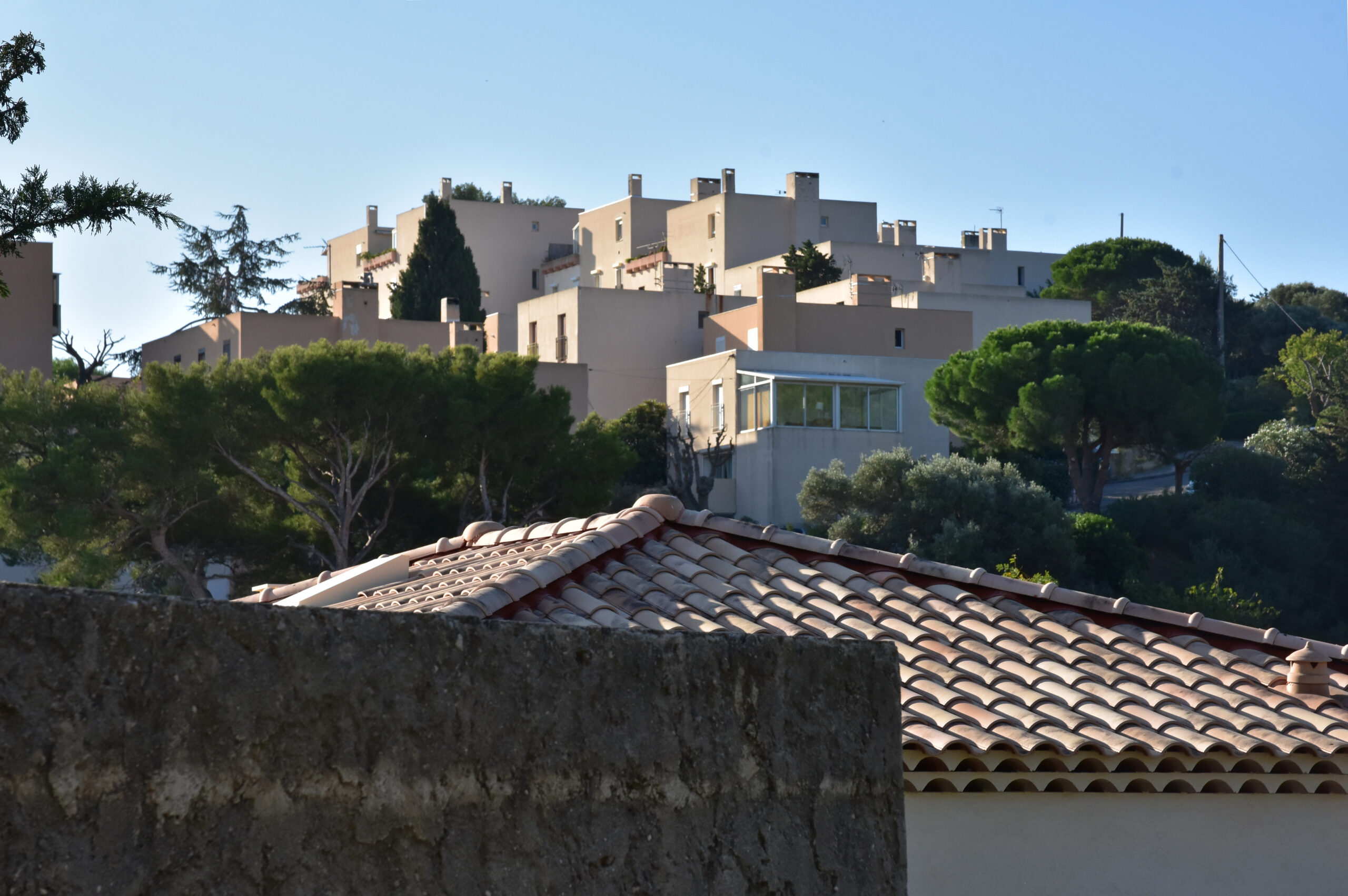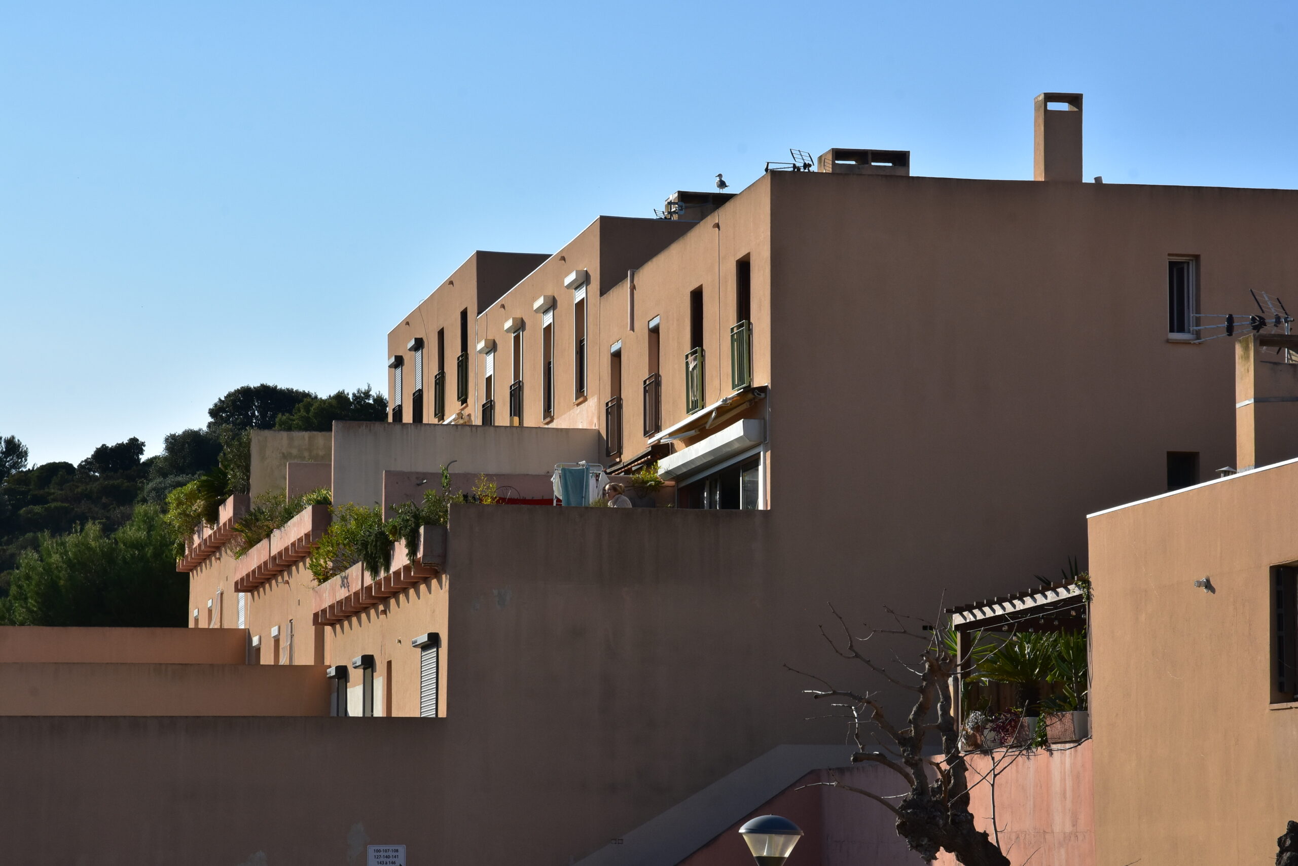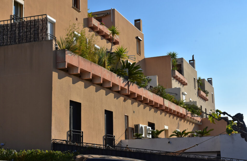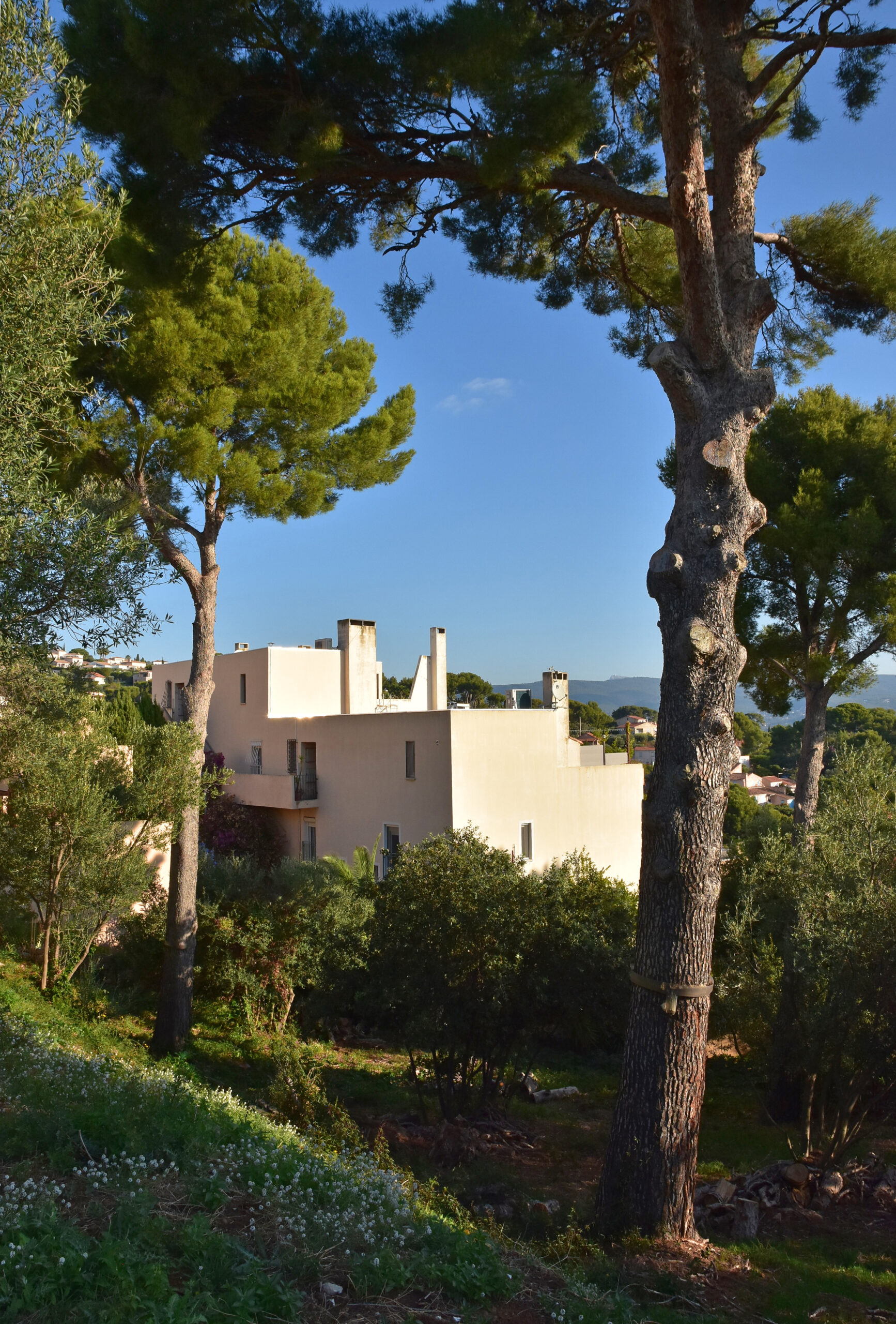 L’effort du concepteur a principalement porté sur la quantité et la qualité des espaces extérieurs privatifs et l’aménagement de vastes terrasses pour chaque logement. Les jeux de niveaux sont intéressants : ils utilisent la pente du terrain. Une pinède a été préservée et constitue un espace tampon, un écrin.