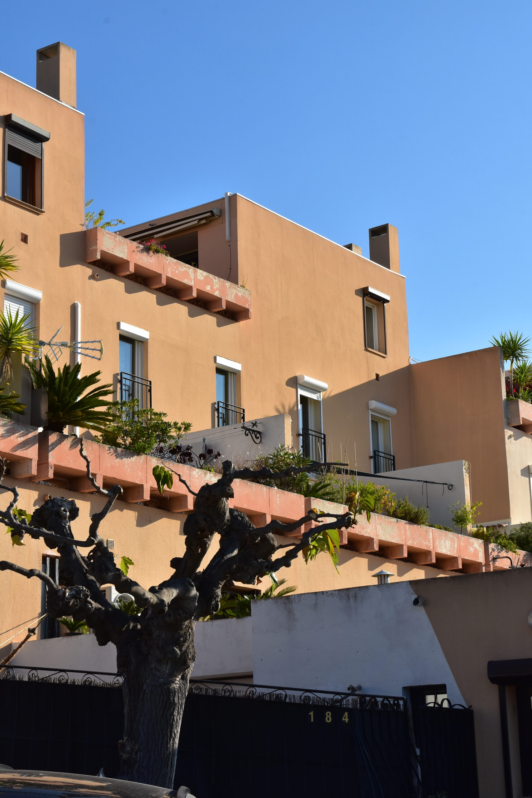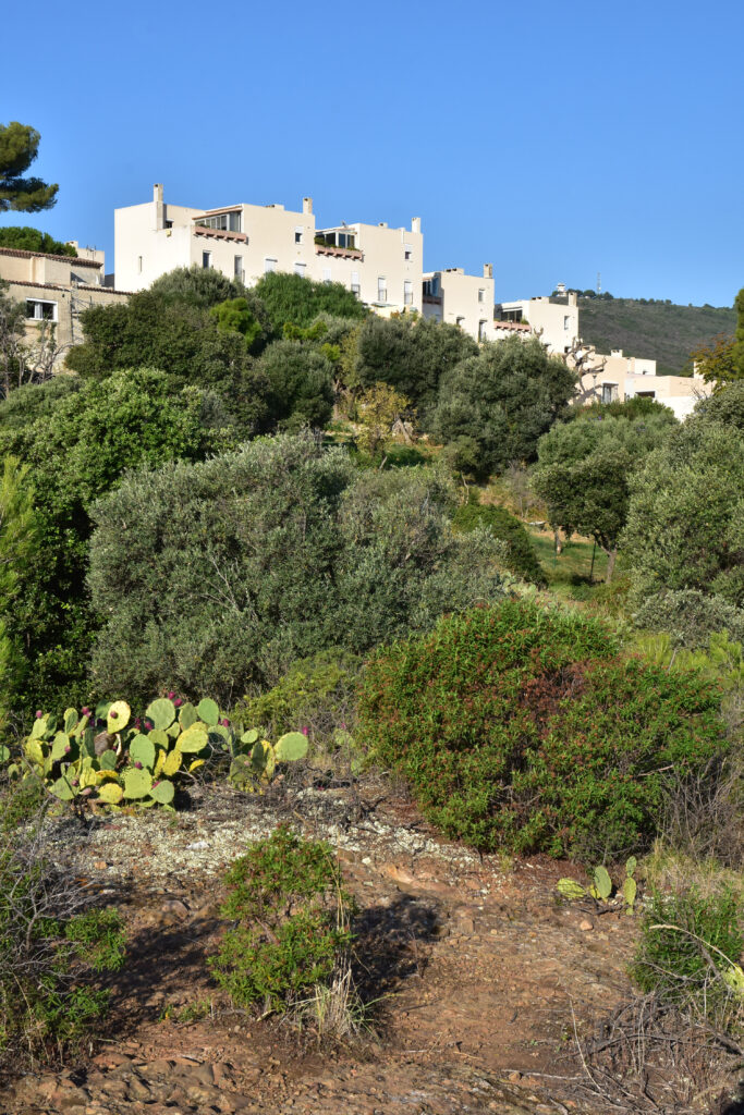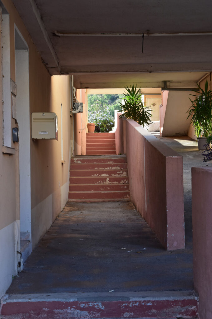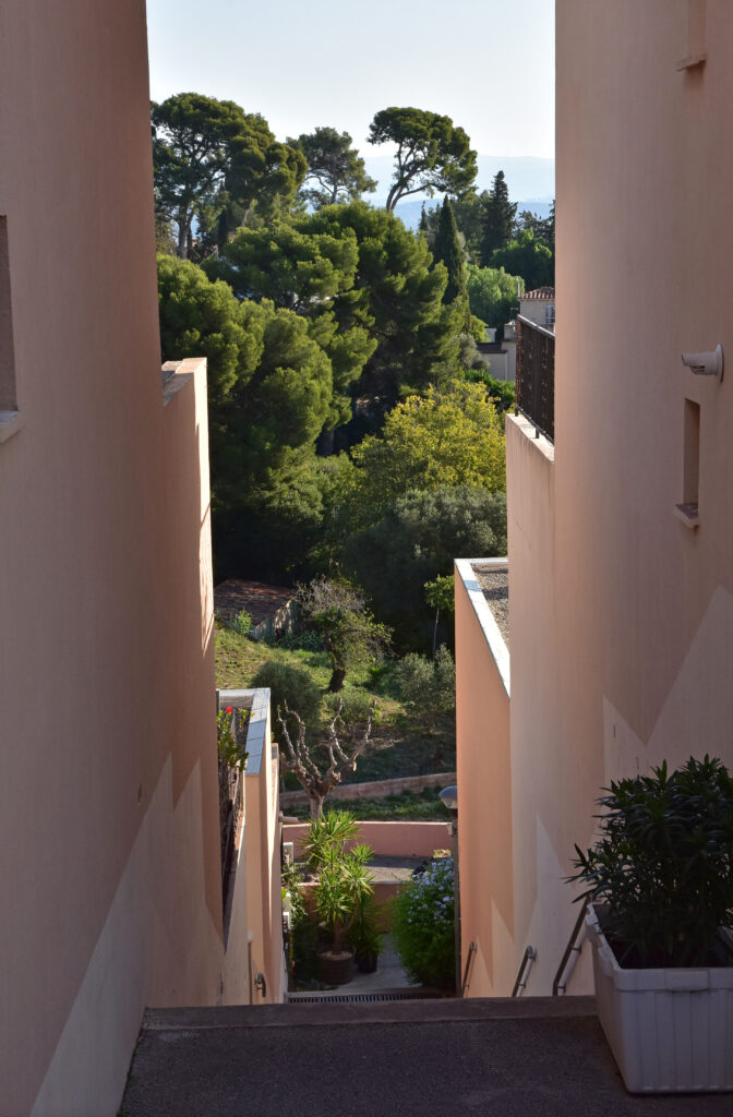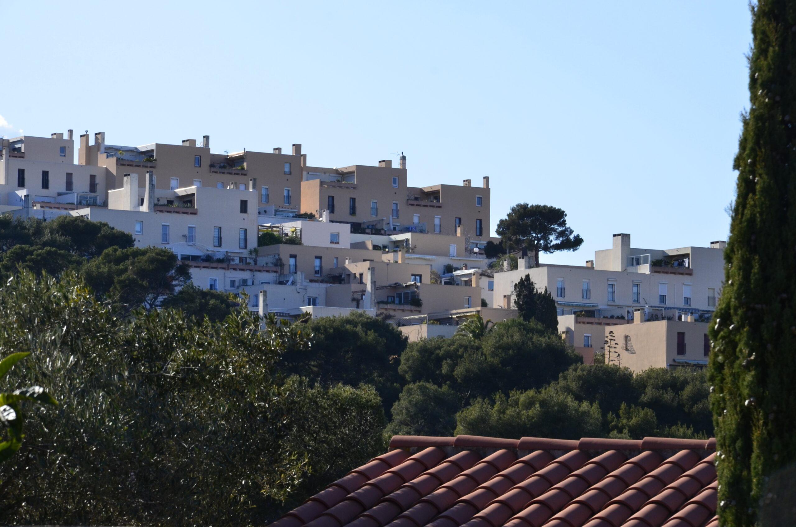 L’effort du concepteur a principalement porté sur la quantité et la qualité des espaces extérieurs privatifs et l’aménagement de vastes terrasses pour chaque logement. Les jeux de niveaux sont intéressants : ils utilisent la pente du terrain. Une pinède a été préservée et constitue un espace tampon, un écrin.