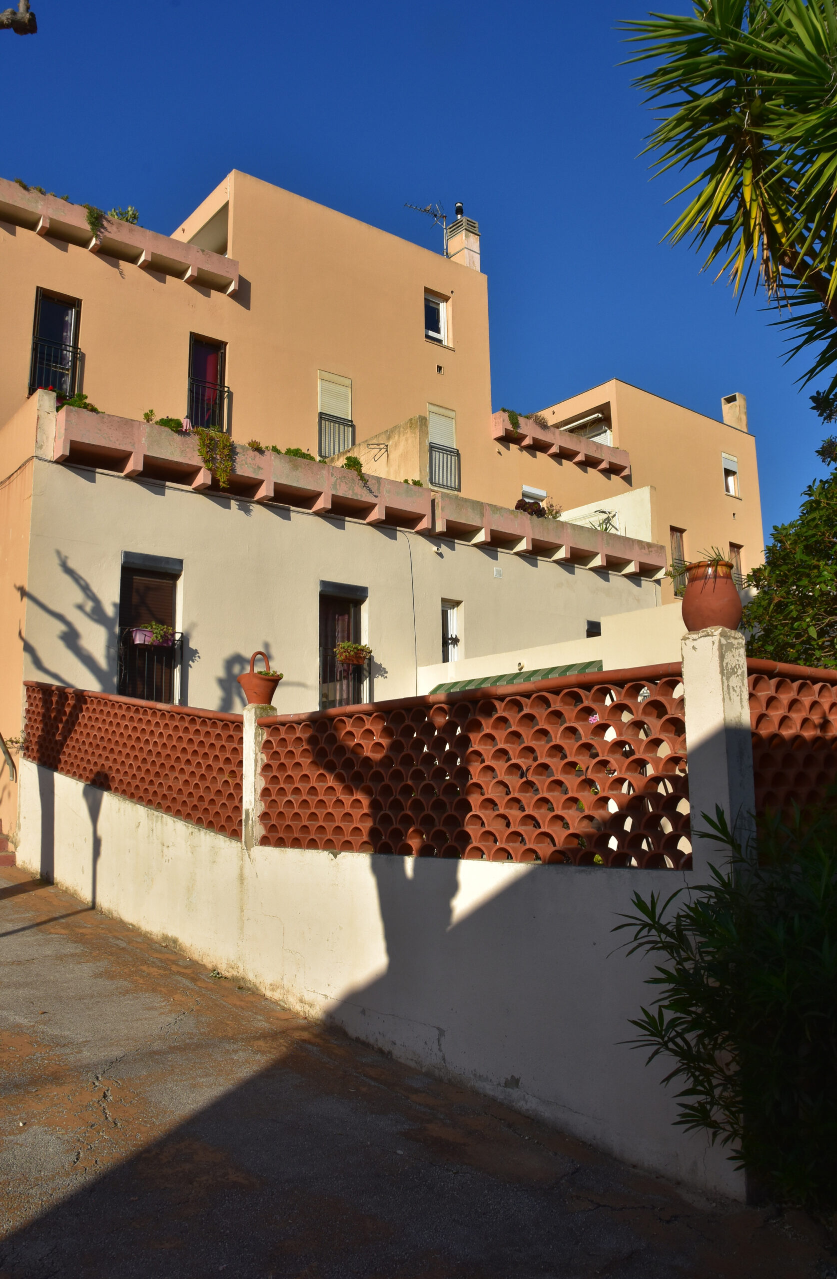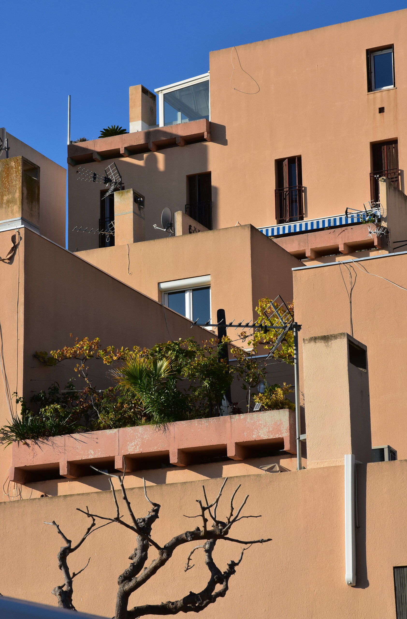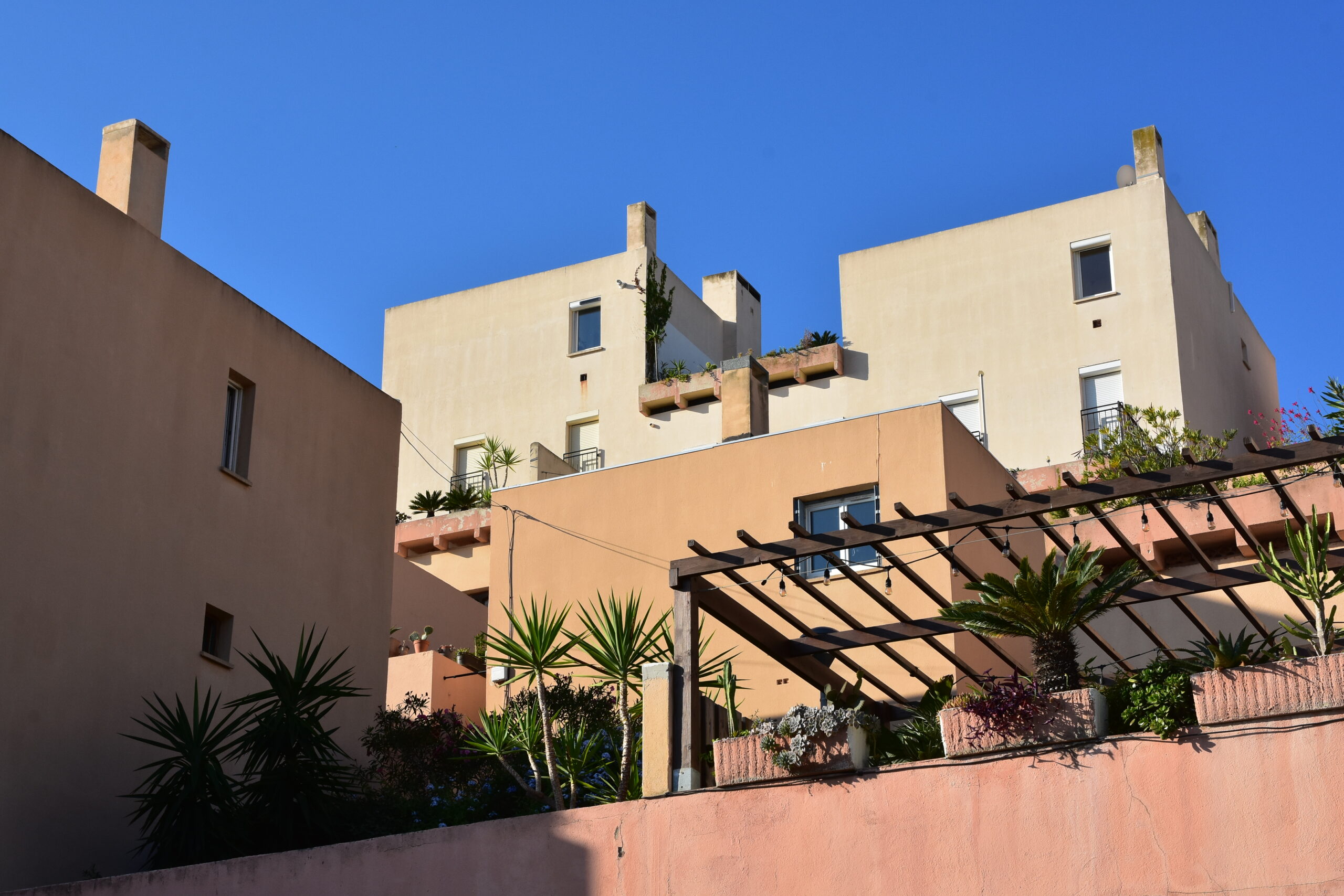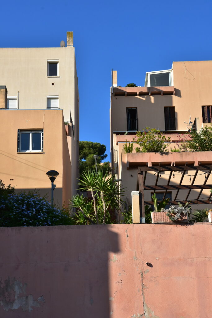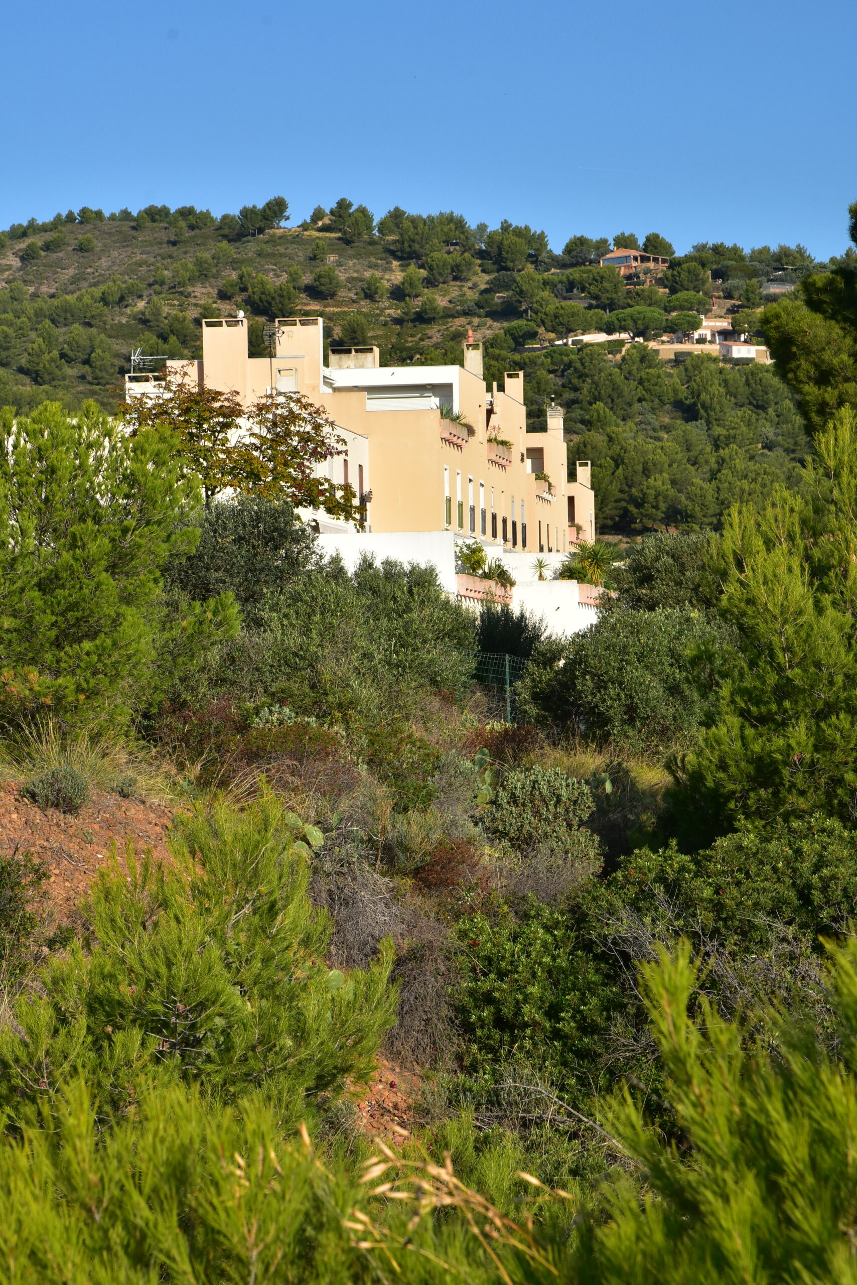 L’effort du concepteur a principalement porté sur la quantité et la qualité des espaces extérieurs privatifs et l’aménagement de vastes terrasses pour chaque logement. Les jeux de niveaux sont intéressants : ils utilisent la pente du terrain. Une pinède a été préservée et constitue un espace tampon, un écrin.