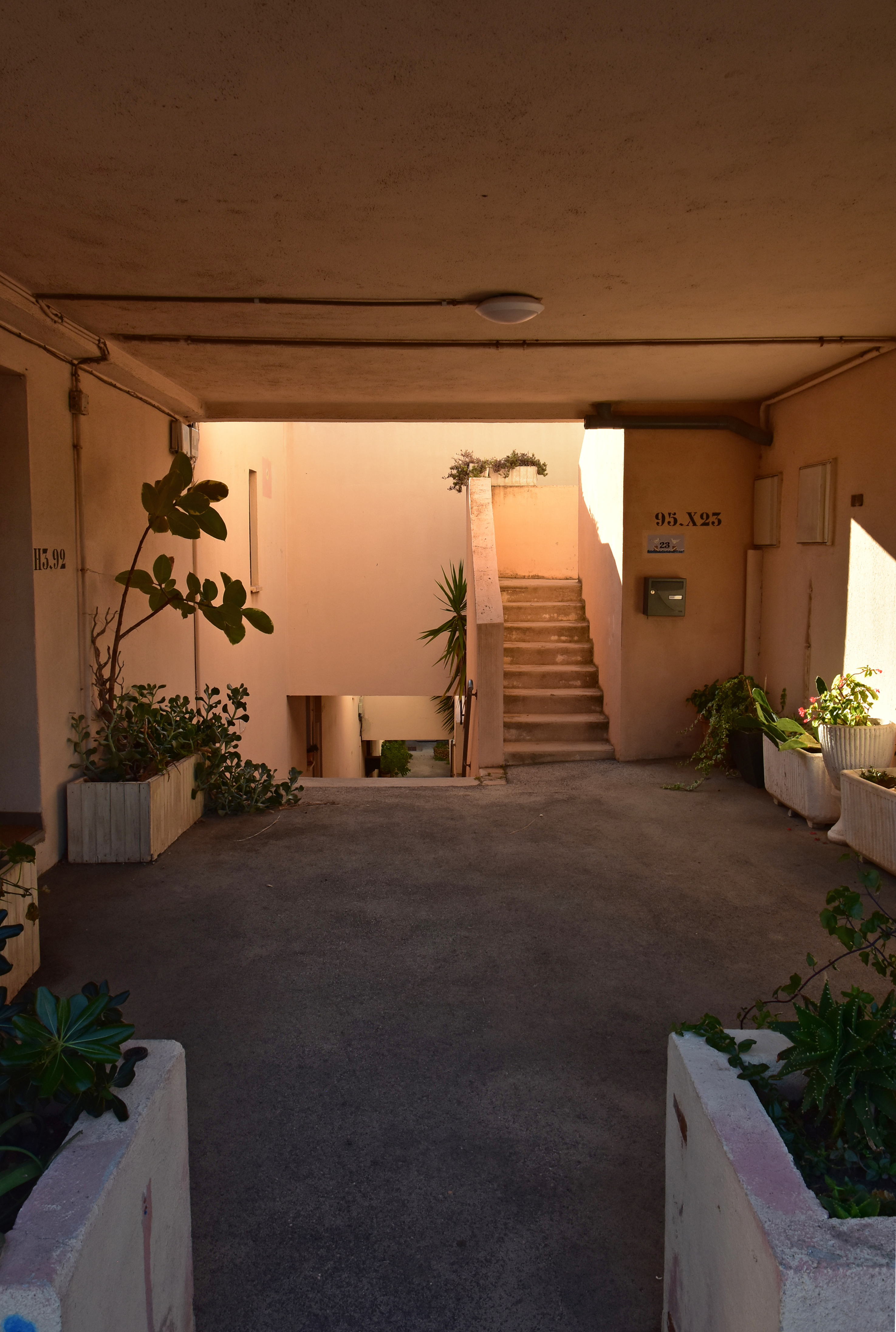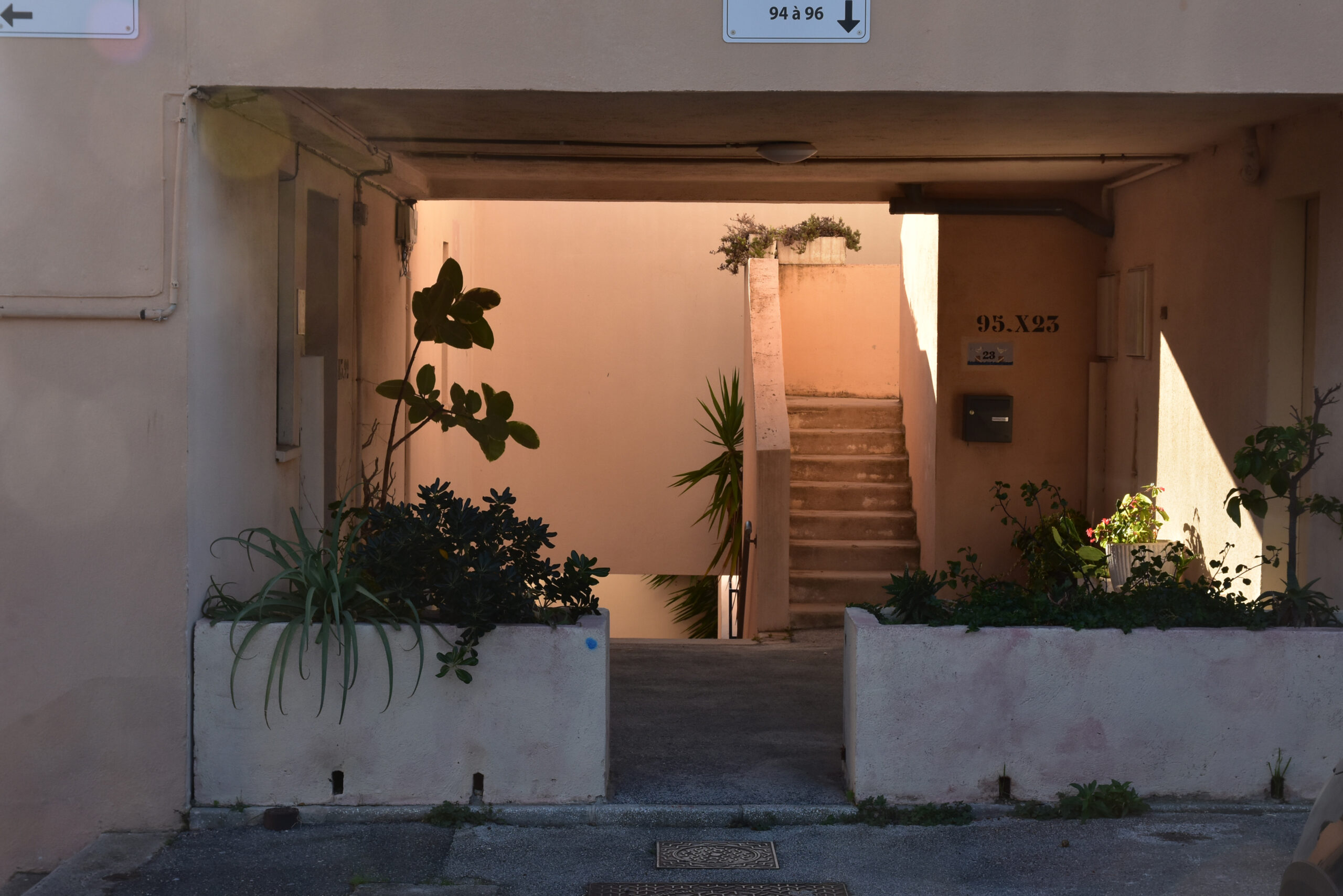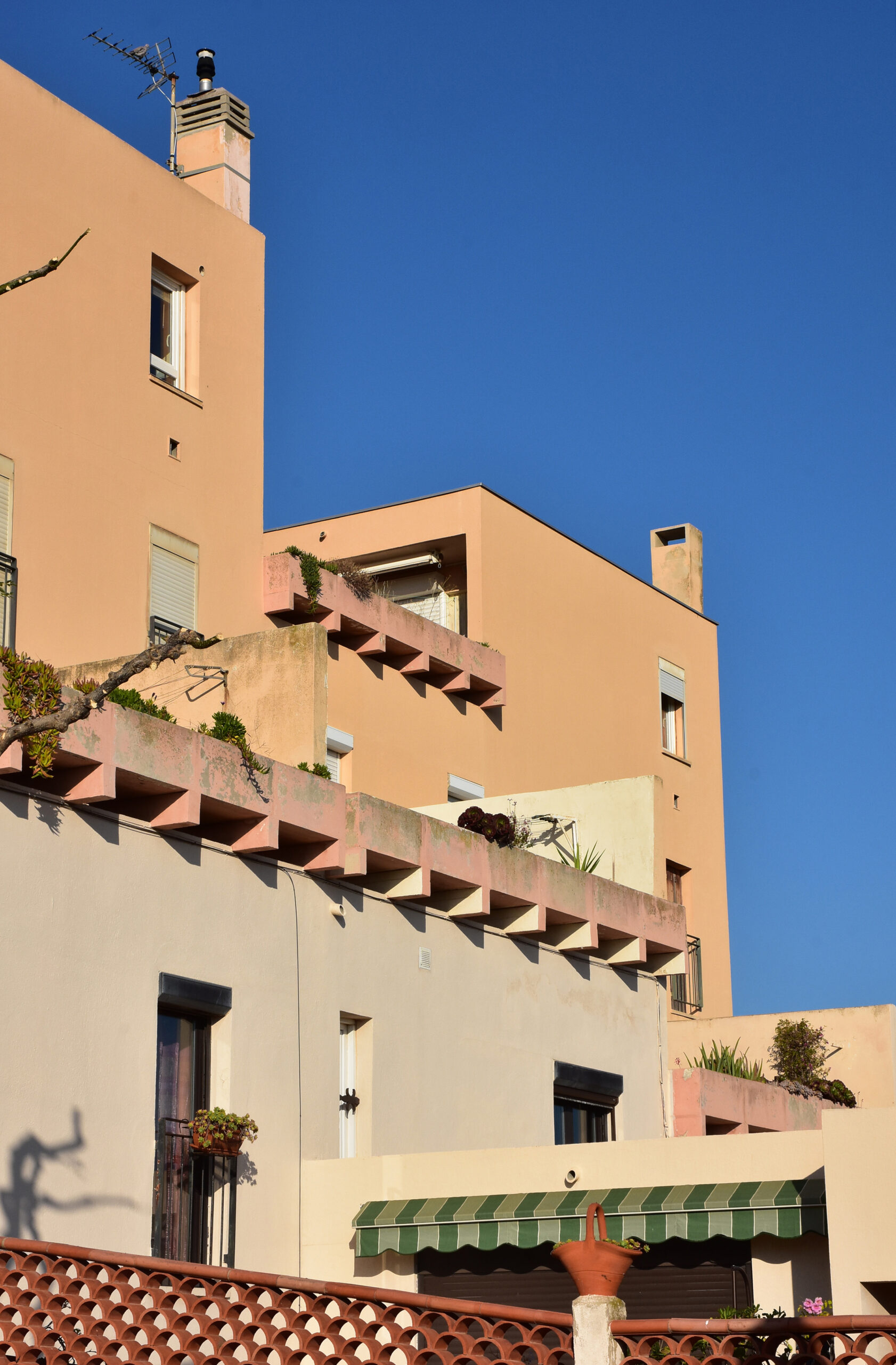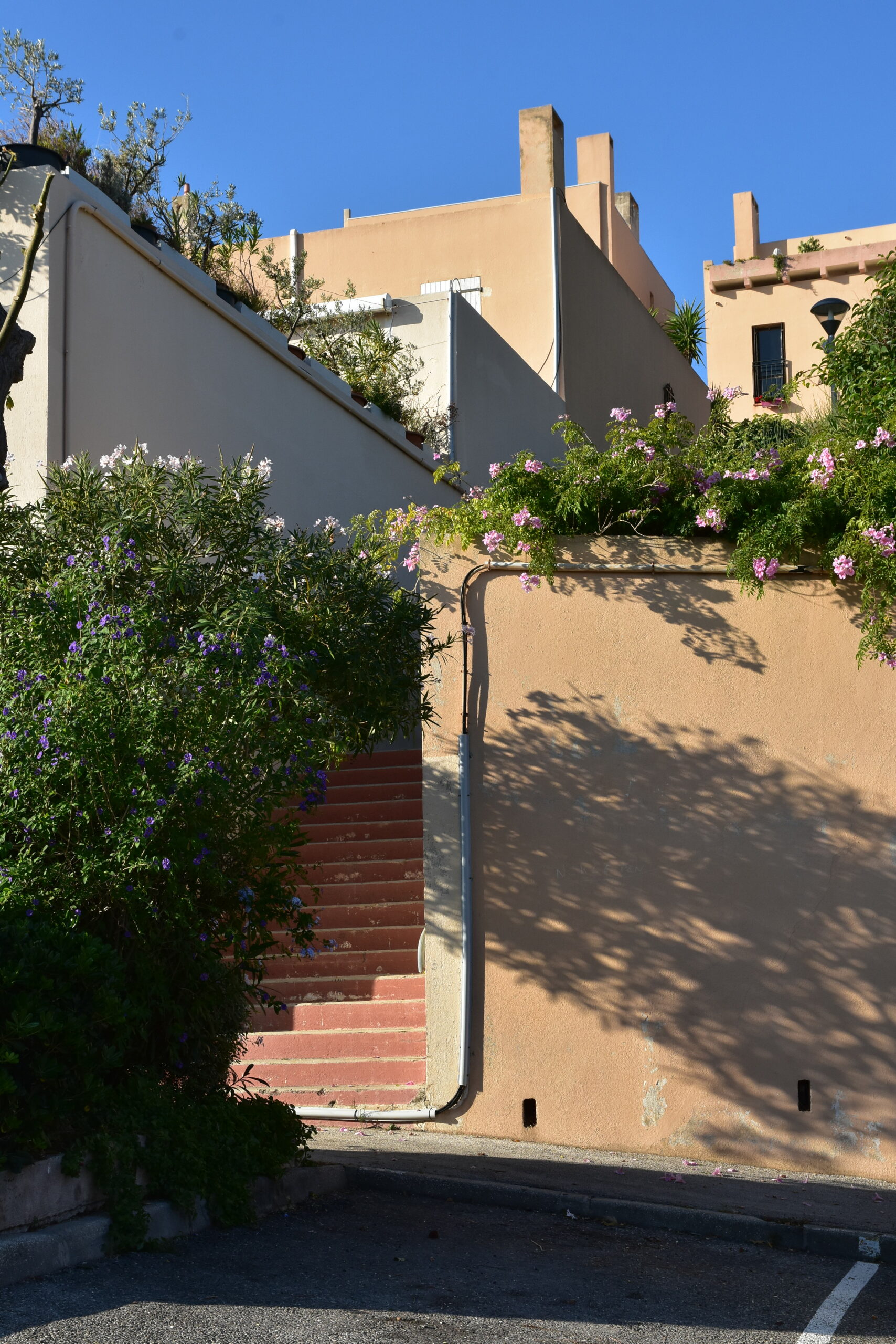 L’effort du concepteur a principalement porté sur la quantité et la qualité des espaces extérieurs privatifs et l’aménagement de vastes terrasses pour chaque logement. Les jeux de niveaux sont intéressants : ils utilisent la pente du terrain. Une pinède a été préservée et constitue un espace tampon, un écrin.