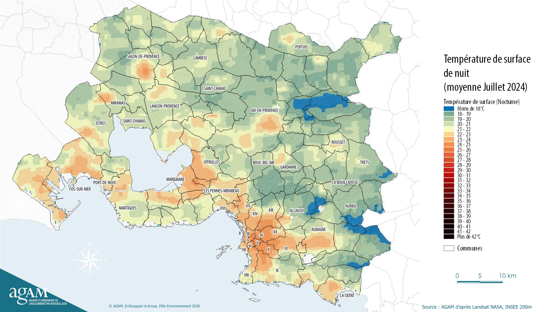 C’est pourquoi l’Agam – consciente de ce biais méthodologique – a produit une donnée de synthèse « jour-nuit » inédite en Région-Sud, appelée Cagnascore. Le Cagnascore, réalisé à l’échelle de la Métropole Aix-Marseille Provence, intègre la température de jour ET de nuit et mêle des moyennes mensuelles ET des dates caniculaires (plus ponctuelles). Il offre ainsi une vision plus réaliste et cohérente de la surchauffe urbaine, notamment dans les centres-villes et périphéries denses. Son utilisation est d’ores et déjà intégrée dans les réflexions sur le Plan Climat Air Energie métropolitain 2 et la Stratégie d’adaptation climatique de la Ville de Marseille.